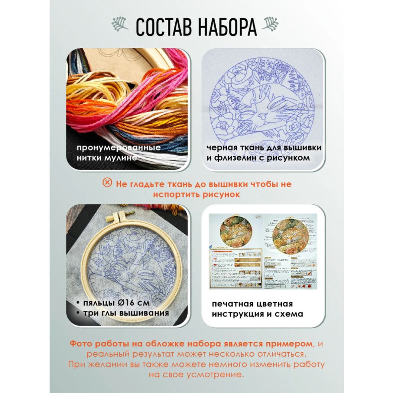 | Основа: | ткань для вышивки и водорастворимый флизелин с нанесенным рисунком |